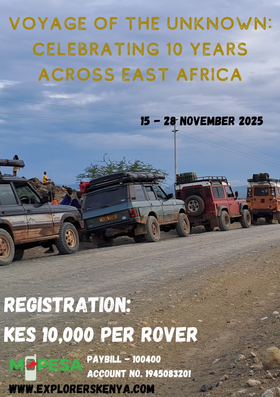 Home Events Camping trips Expeditions Voyage Of The Unknown Voyage Of The UnknownCelebrating 10 Years Across East AfricaFind all the details you need of this trip in the document below. Loading... Taking too long? Reload document | Open in new tab Download [758.61 KB] Full Names *Email Address *Phone *How many Adults? *How many Children?Would you like a branded expedition T-shirt? *YesNoSelect your t-shirt sizes and pieces neededS - Kids & Adult SmallM - MediumL - LargeXL - Extra LargeXXL - Double LargeXXXL - Triple LargeTotal PriceWhat Land Rover Model do you own? *LR Defender 110LR Freelander 1LR Freelander 2LR Series ILR Series IILR Series IIILR Range Rover ClassicLR Range Rover EvoqueLR Range Rover VelarLR Range Rover SportLR Range Rover VogueLR Range Rover p38LR Discovery 1LR Discovery 2LR Discovery 3LR Discovery 4LR Discovery SportLR Defender 90LR Defender 110LR Defender 130LR 90LR 101 FCLR 110LR 127LR Stage 1 V8LR LightweightWhat is the license plate? *0 / 8Lipa Na MpesaKindly pay via our MPESA paybill number: 100400 Account number: 1945 083 201Your registration will be complete once payment is confirmed.Total PriceMPESA verification code *Register+ Add to Google Calendar+ iCal / Outlook exportThe event is finished. Tags: East African Road Trip, The Explorer's Club of Kenya, Voyage of the unknown DateNov 15 - 25 2025Expired! Time All Day LocationEast African Road Trip CategoryCamping tripsExpeditionsNext Event Aberdares Fishing Cottages Camping Trip DateMar 20 - 22 2026 Time All DayShare this event